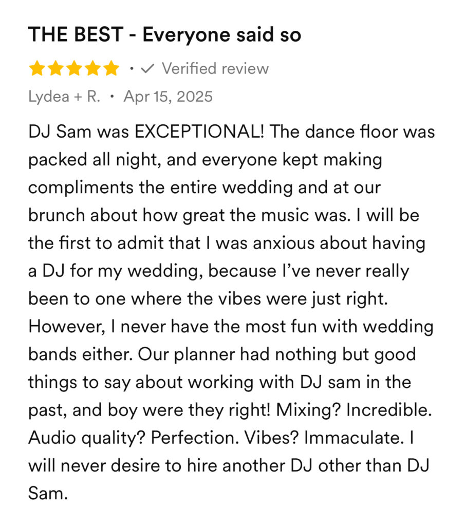 Read our reviews and check out our Instagram for more content! Scroll to submit an inquiry below to secure a quality DJ for your next event!