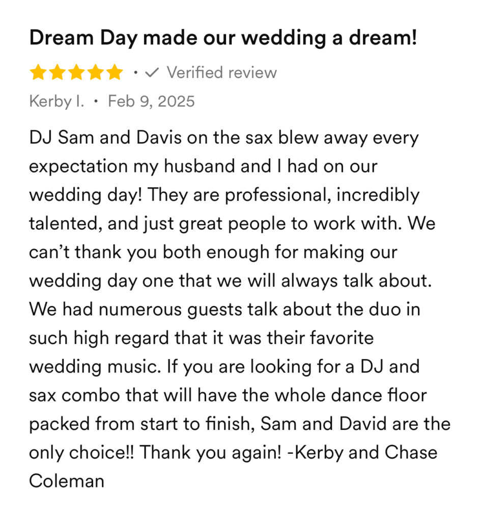 In addition, we provide Sax musicians and live music experiences. We can elevate your wedding entertainment.